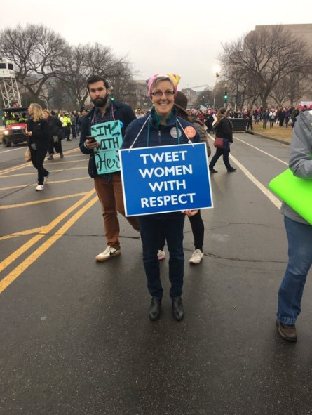 Một hình ảnh khá vui nhộn. Người phụ nữ với tấm bảng: "Tweet về phụ nữ với sự tôn trọng". Đằng sau là chàng trai cùng tấm bảng "I'm With Her" - khẩu hiệu từng được sử dụng trong cuộc vận động tranh chức Tổng thống Mỹ của bà Hillary Clinton.