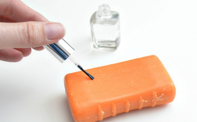 Quết sơn móng tay trong lên toàn bộ bánh xà phòng, đảm bảo mẹ bạn loay hoay xát xà phòng cả ngày cũng không làm sao để tạo ra bọt.