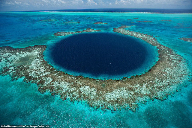 National Geographic nói Belize là một trong những rạn san hô đa dạng sinh học nhất trên trái đất và là nơi cư trú của rất nhiều loài quý hiếm đang bị đe dọa. Đây là hố Blue Hole sâu hơn 330 mét nhìn từ trên trực thăng xuống.