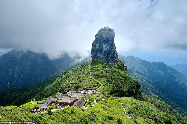 Trèo lên đỉnh núi Phạm Tịnh Sơn giống như đi vào “một biển mây”. Trong ảnh là Đỉnh Vàng Mây Đỏ, một trong ba đỉnh cao nhất của Phạm Tịnh Sơn và là di sản thế giới của UNESCO.