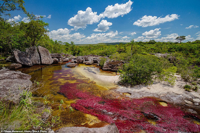 Giữa tháng Bảy và tháng Mười Một, thực vật thủy sinh trên dòng Caño Cristales chuyển con sông thành một trận bạo loạn của màu sắc. National Geographic nói: 'Bơi ở đây giống như tìm vàng ở phía cuối cầu vồng”.
