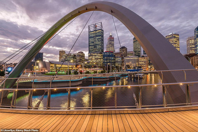 Các vòm của cầu Elizabeth Quay đóng khung thành phố Perth, nơi mà National Geographic miêu tả là 'thành phố lớn xa xôi nhất thế giới'