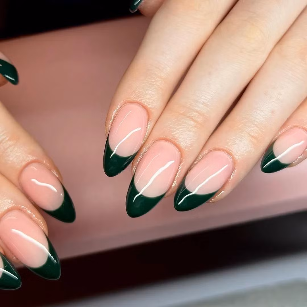 Màu xanh lá cây là truyền thống của Giáng sinh, những tông xanh lá trầm và đậm trông sang trọng và sáng da hơn các tông xanh lá tươi. Đặc biệt là màu xanh trầm được sơn đầu móng kiểu Pháp gợi nhớ đến cây tầm gửi Giáng sinh ở Londontown.