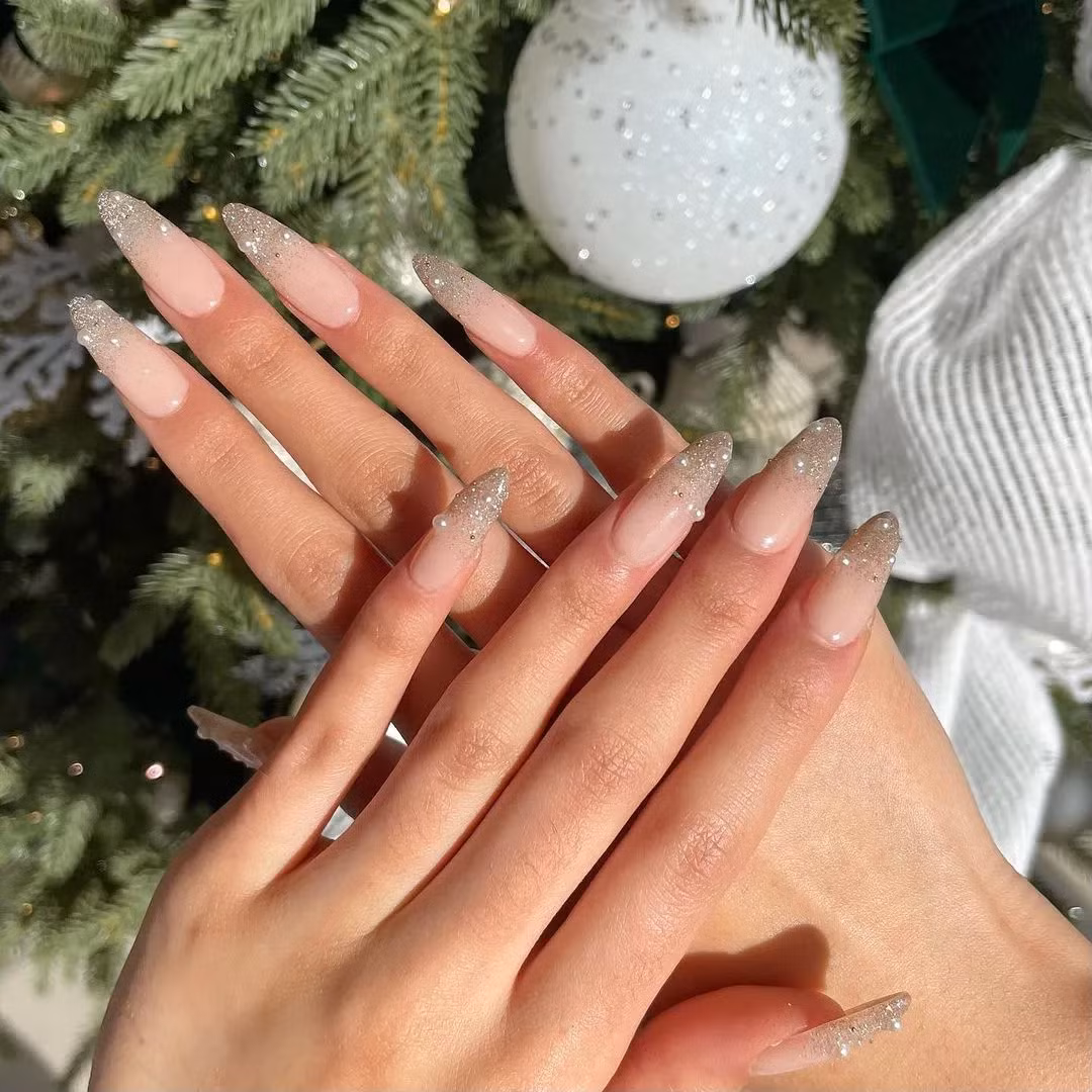 Mẫu móng có phần lấp lánh nhấn ở đầu móng được lấy cảm hứng từ quả cầu tuyết. Thêm vài viên ngọc trai để tăng sự sang trọng và bắt mắt hơn. Bộ móng lung linh nhưng có tông trắng chủ đạo sẽ không làm khó các nàng khi lựa chọn trang phục
