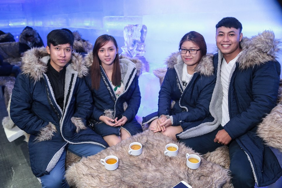 Teen rì-viu: Bạn Vân Thanh (THPT Mạc Đĩnh Chi, TP.HCM) kể "Mình rủ nhỏ bạn thân thử trải nghiệm này. Được bạn bè "cảnh báo" trước là nhiệt độ cực kì thấp có -10 độ C và mình cũng "thủ" sẵn khăn choàng, áo khoác dày nhưng thật không tin được là nó lạnh như vậy! Hai đứa mình chỉ ngồi trong quán được 10 phút thôi mà thở phì phì ra khói rồi í. Cả hai cùng chọn món Cappuccino nóng hôi hổi mà ly nước vừa mới bưng ra 5 phút thôi cũng đã nguội bớt nhiều luôn. Hai đứa cứ mải mê ngắm và tranh thủ chụp choẹt xung quanh. Phút thứ 45, tụi mình không thể chịu nổi cái lạnh như Bắc Cực này nữa nên đành ra ngoài, hic. Điều buồn cười là cả hai đều "kính cận" nên khi thay đổi đột ngột, kính của hai đứa đều có lớp sương mờ bao phủ".