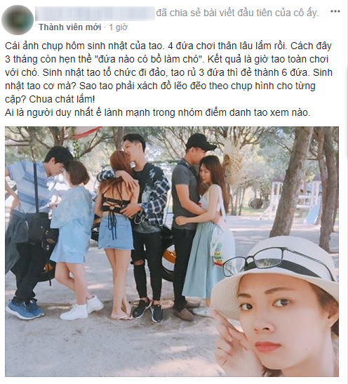 Chủ nhân bài viết “hậm hực” chia sẻ: “Bốn đứa chơi thân với nhau lâu lắm rồi. Cách đây 3 tháng còn hẹn thề: “Đứa nào có bồ là chó”. Kết quả là giờ mình toàn chơi với chó. Sinh nhật mình tổ chức đi đảo, rủ 3 đứa “đẻ” thành 6. Rõ ràng sinh nhật mình mà phải xách đồ lẽo đẽo theo sau chụp hình cho từng cặp. Chua chát lắm!” kèm bức ảnh chụp 3 cặp đôi đang “tình bể bình”.
