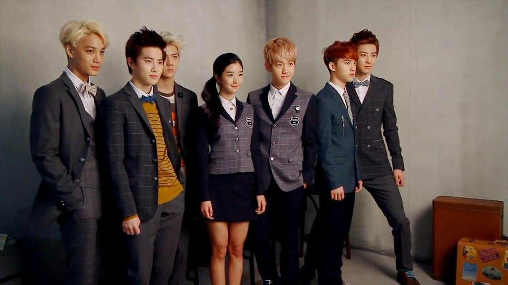 Chanyeol (EXO) đã chịu thiệt đứng ra ngoài rìa bức ảnh rồi, mà vẫn phải khom chân khụy gối cho đẹp đội hình.
