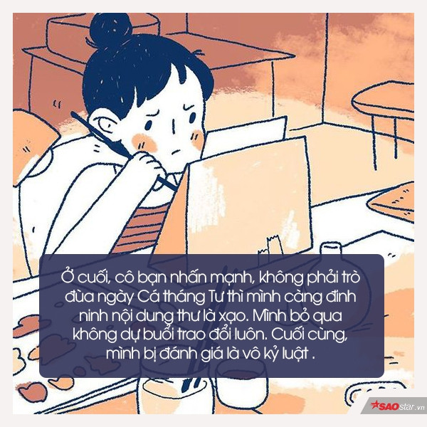 Ở cuối, cô bạn nhấn mạnh, không phải trò đùa ngày Cá tháng Tư thì mình càng đinh ninh nội dung thư là xạo. Mình bỏ qua không dự buổi trao đổi luôn. Cuối cùng, mình bị đánh giá là vô kỷ luật và nhận được lời phê không tốt vào cuối kỳ thực tập”, sự cố nhớ đời được một cô bạn số nhọ ngậm ngùi chia sẻ.
