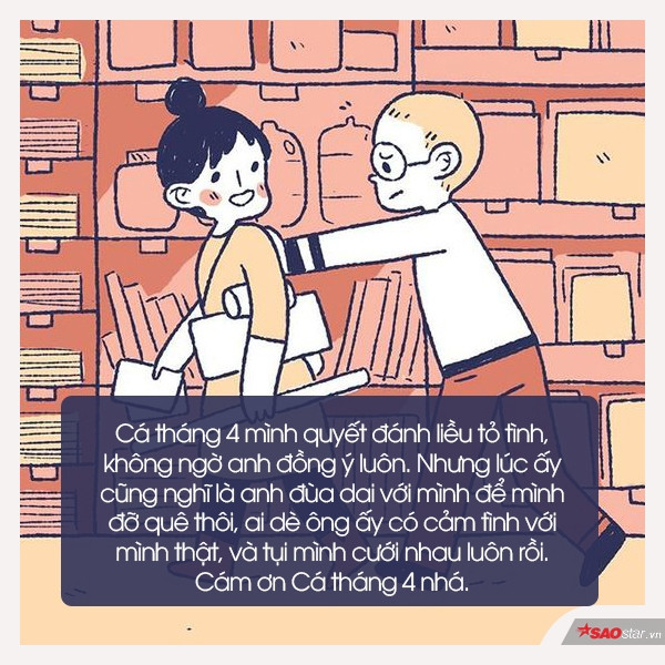 6. “Chuyện của mình vào Cá tháng Tư lại có kết cục viên mãn đến không ngờ. Mình thích crush từ lâu nhưng ngại chả nói, bởi nghĩ không xứng với anh. Được bạn bày cho, Cá tháng Tư mình quyết đánh liều tỏ tình, không ngờ anh đồng ý luôn. Nhưng lúc ấy cũng nghĩ là anh đùa dai với mình để mình đỡ quê thôi, ai dè ông ấy có cảm tình với mình thật và tụi mình cưới nhau luôn rồi. Cám ơn Cá tháng Tư nhé, nhờ có ngày này mới hết ế”, chắc đây là cô nàng may mắn nhất câu được cá to ngày Cá tháng Tư rồi.