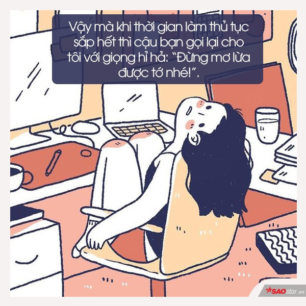 Vậy mà khi thời gian làm thủ tục sắp hết thì cậu bạn gọi lại cho tôi với giọng hỉ hả: “Đừng mơ lừa được tớ nhé!”.