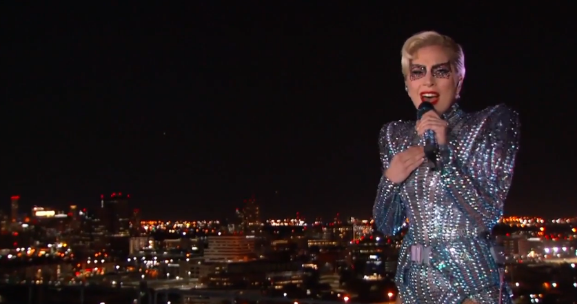 Mở đầu chương trình với màn trình diễn bản mash-up hai ca khúc ngợi ca nước Mỹ là God Bless America và This Land Is Your Land trên mái vòm sân vận động, Lady Gaga bay thẳng (theo đúng nghĩa đen) về phía trung tâm sân khấu trong bộ trang phục lấp lánh pha lê.