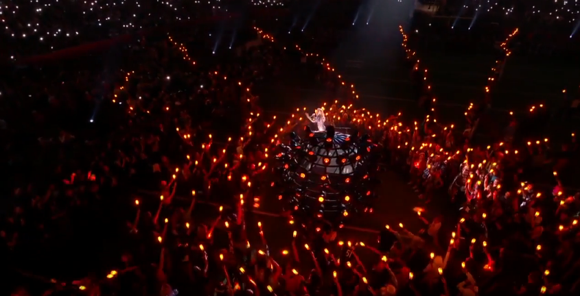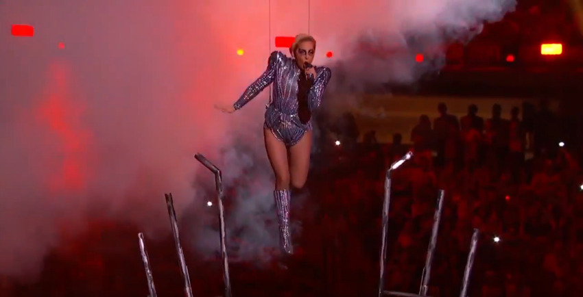 Cô được nhấc bổng lên không trung sau đó, một tiểu xảo thường được dùng tại sân khấu Super Bowl Halftime Show.