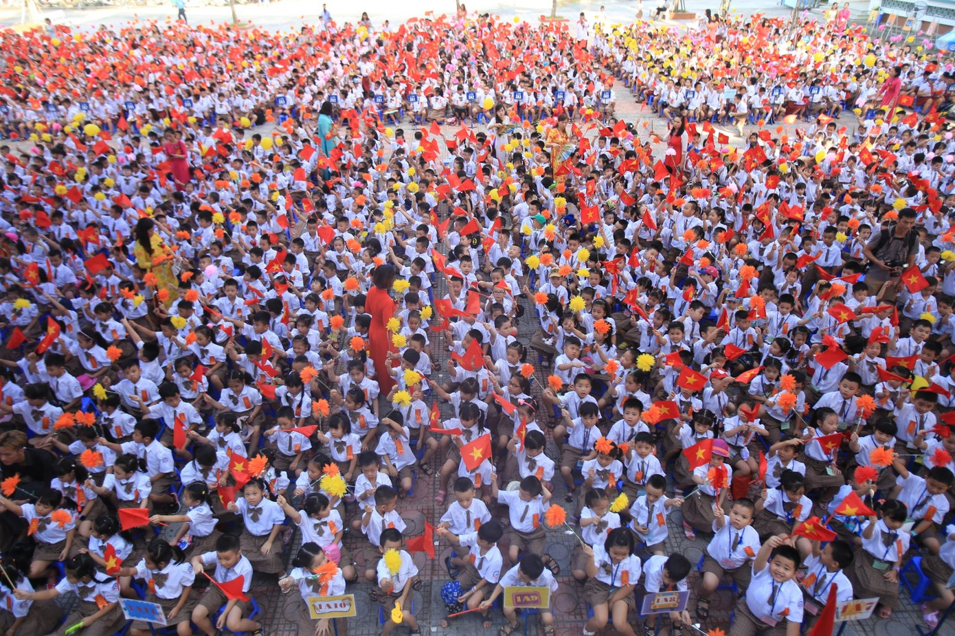 Sáng 5/9, học sinh cả nước bước vào năm học mới. 6h45, trường tiểu học Chu Văn An (quận Hoàng Mai, Hà Nội), hàng nghìn học sinh đã ngồi xếp hàng ở sân trường, phụ huynh, giáo viên đứng bên quạt mát.