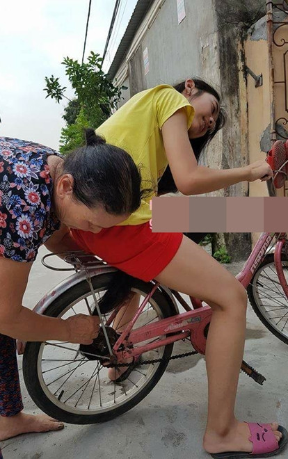 Vừa nói xong, quay đi một cái thì nghe thấy "uỳnh". Quay lại hóa ra tóc em nó quấn vào xích xe, không đạp được nên mới đâm vào cổng.