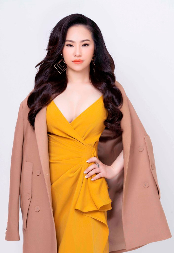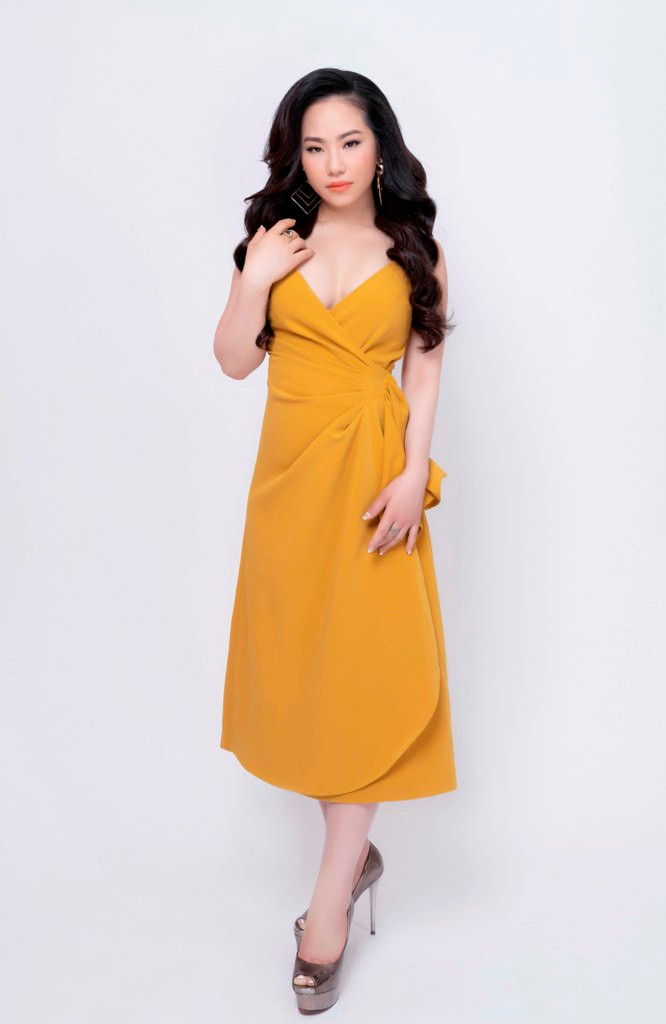 Để thoát khỏi những bộ cánh thường bị cho là "sến", Lương Bích Hữu đã thực sự tinh tế khi dễ dàng kết hợp cùng kiểu váy nữ tính màu vàng đất có thiết kế đường cắt cúp ôm sát cơ thể và kết hợp áo vest nâu khoác ngoài trong lần trở lại này.