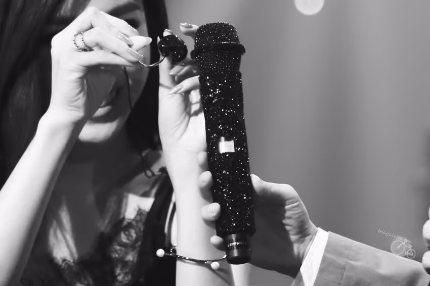 Tiffany (SNSD) lại sở hữu chiếc micro gắn pha lê đen lấp lánh, nhìn vừa bí ẩn vừa nổi bật trên sân khấu.
