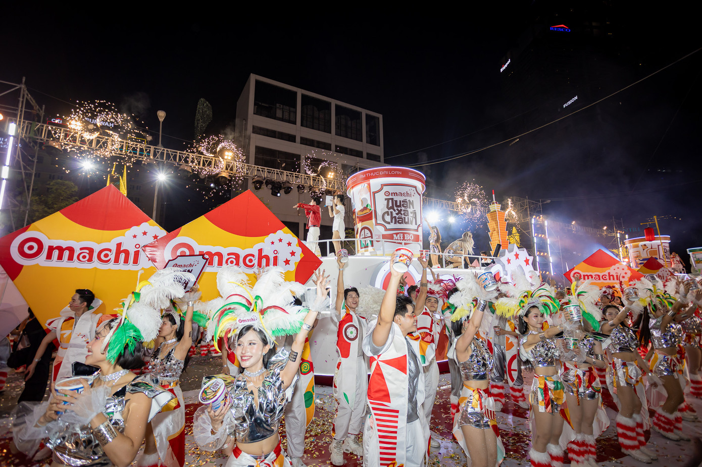 Chương trình diễu hành nghệ thuật “Omachi Debut 2025 – Quán Xá Châu Á” thu hút hàng chục nghìn người xem tại trung tâm quận 1 – TP.HCM với màn diễu hành hoành tráng đến từ 350 vũ công chuyên nghiệp, 5 xe diễu hành khổng lồ đại diện cho 5 món ngon đến từ 5 nước trong bộ sưu tập “Quán Xá Châu Á” mới của Omachi. Người xem được mãn nhãn khi tận mắt chứng kiến hàng chục bộ cánh khổng lồ sải bước cung đường Đại lộ Lê Lợi dài đến 250m, các tiết mục ánh sáng được dàn dựng công phu và màn bắn pháo giấy, pháo hoa rực rỡ sắc màu. Sự xuất hiện và trình diễn cực nóng bỏng của đại sứ thương hiệu HIEUTHUHAI khiến cho không khí tại “Omachi Debut 2025: Quán Xá Châu Á” bùng nổ hơn bao giờ hết.