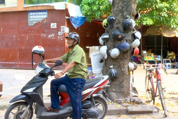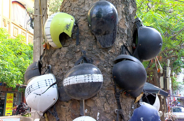 Gốc cây xà cừ già được ông Địch treo lủng lẳng các loại mũ bảo hiểm đã bị hỏng.