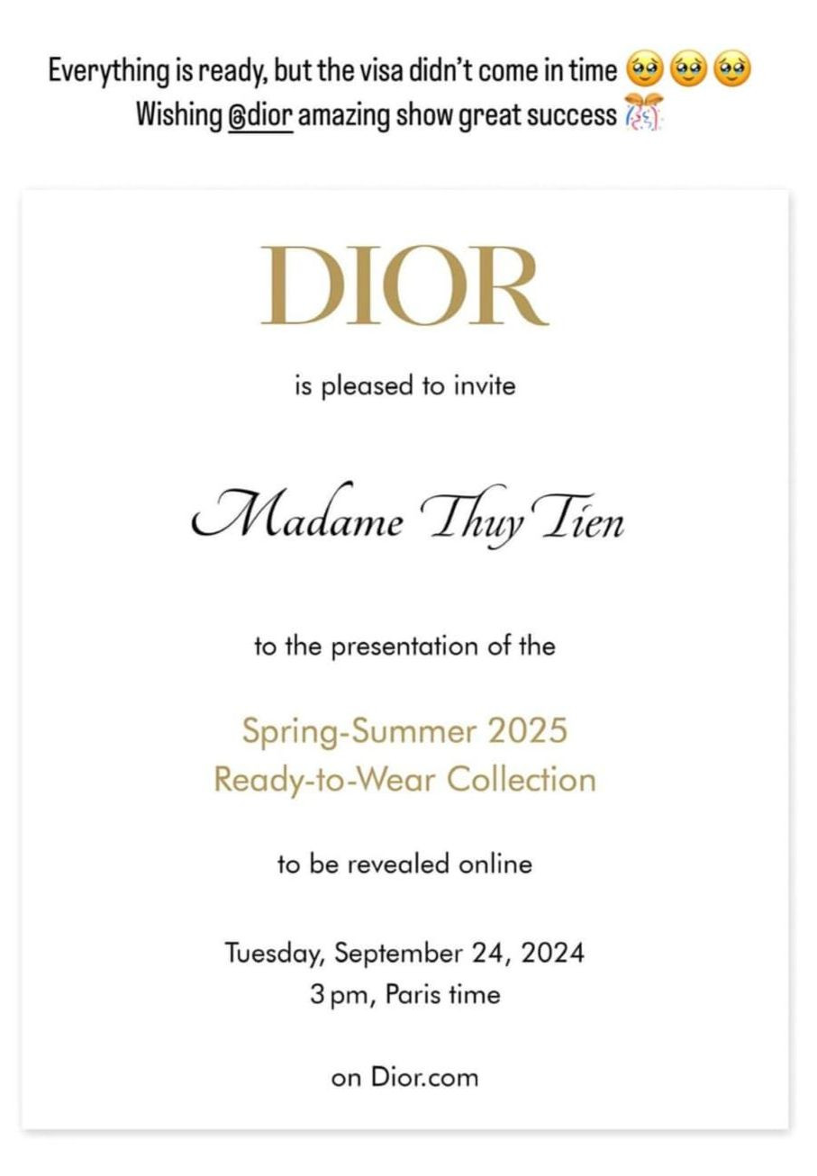 Tuy nhiên, trước thềm sự kiện, Hoa hậu Thùy Tiên gây tiếc nuối khi thông báo không thể có mặt tại sự kiện ra mắt BST Xuân Hè 2025 của nhà mốt Pháp. Nguyên nhân là do người đẹp không kịp làm visa. “Mọi thứ đã chuẩn bị sẵn sàng nhưng visa không đến kịp đúng hạn.”, Thùy Tiên chia sẻ trên Story.