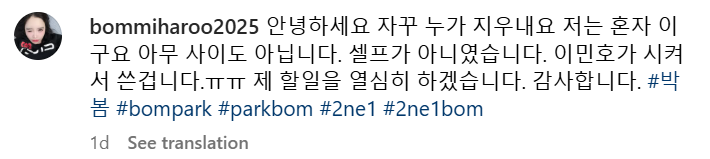 Theo bài đăng đính chính gần nhất còn hiển thị trên Instagram cá nhân mới của Park Bom - @bommiharoo2025, cô viết: "Chào cả nhà, ai đó cứ xóa bài của mình. Mình hiện đang độc thân và không yêu đương với ai cả. Những việc kia không phải mình làm. Mình viết điều này vì phía Lee Min Ho bảo thế. Mình sẽ cố gắng hết mình cho công việc. Cảm ơn mọi người".