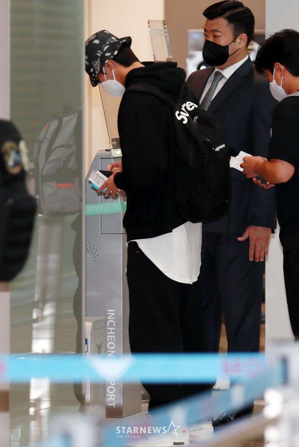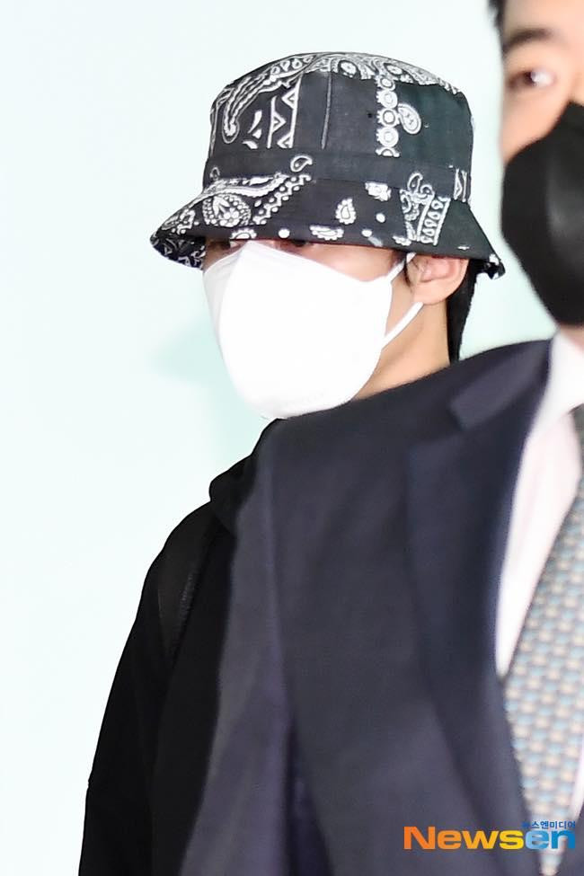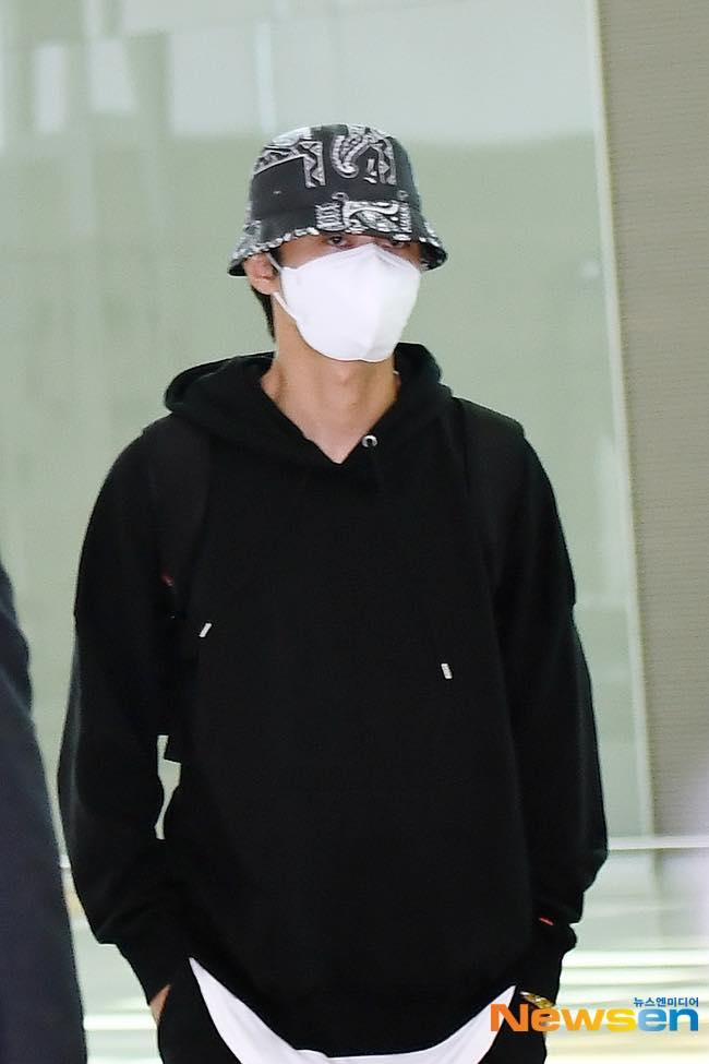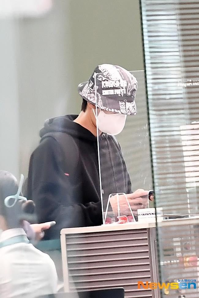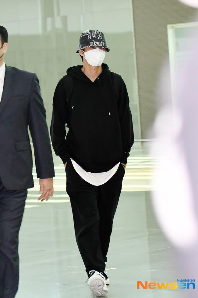 | Park Seo Joon diện trang phục giản dị, làm thủ tục tại sân bay, chuẩn bị rời Hàn Quốc. |