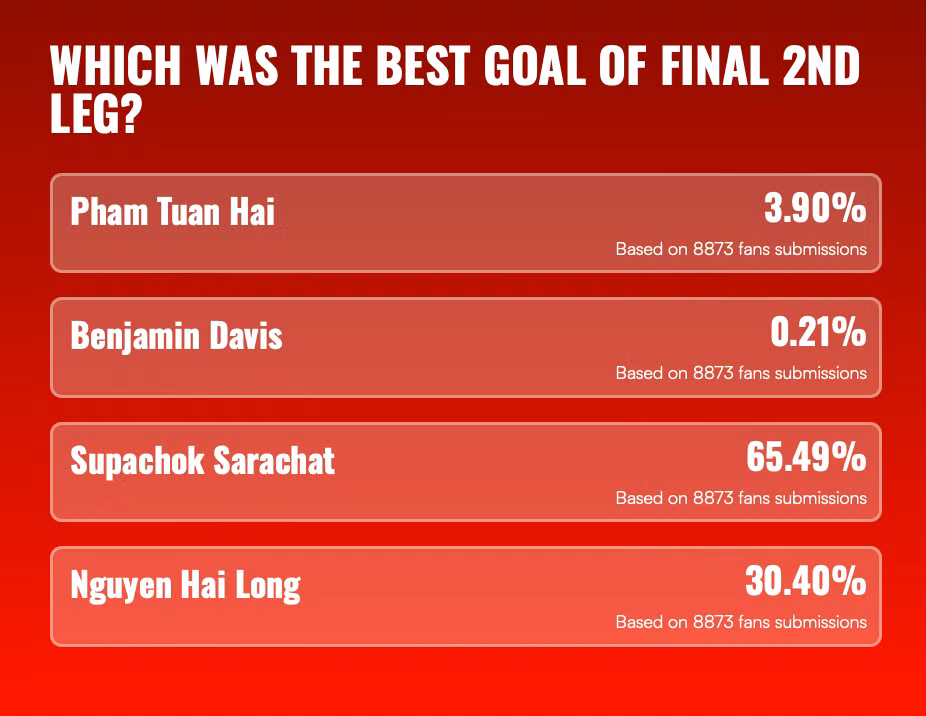Ở hạng mục bình chọn Bàn thắng đẹp nhất trận chung kết lượt về AFF Cup 2024 giữa ĐT Việt Nam và ĐT Thái Lan, pha lập công của Supachok cũng đang dẫn đầu với 65,49% phiếu bầu, vượt cú sút xa của Hai Long với 30,40% phiếu bầu, trên tổng số 8.873 lượt bình chọn trực tuyến.