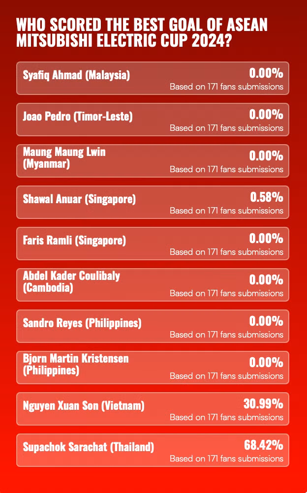 Tính đến thời điểm 10h30' ngày 7/1, Supachok (ĐT Thái Lan) nhận 68,42% phiếu bầu từ người hâm mộ trên trang chủ ASEAN Cup 2024 đối với hạng mục Bàn thắng đẹp nhất giải đấu, vượt qua Nguyễn Xuân Son của ĐT Việt Nam với 30,99% phiếu bầu, sau đó là Shawal Anuar (ĐT Singapore) với 0,58% phiếu bầu, trên tổng số 171 lượt bình chọn.