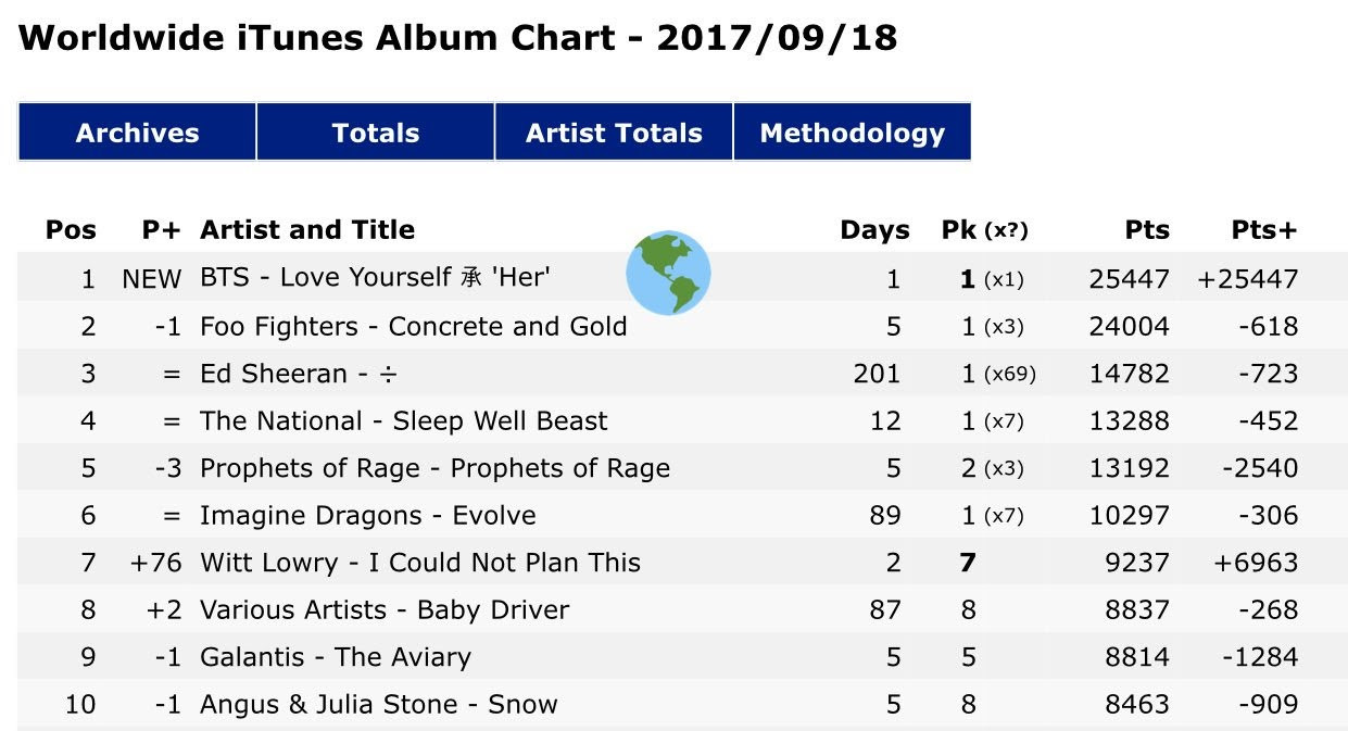 Không chỉ riêng YouTube, album mới của BTS còn “làm mưa làm gió” trên các BXH iTunes. Sau 8 tiếng, album Love Yourself 承 Her đã đạt No.1 iTunes tại 73 quốc gia, và đây cũng là thành tích khủng nhất đối với một nghệ sỹ K-Pop. Không những vậy, Love Yourself: Her còn đứng đầu Ranking Worldwide Album và DNA cũng giữ vị trí No.1 Worldwide Song của iTunes. Các ca khúc còn lại cũng đều có mặt trong Top 120.