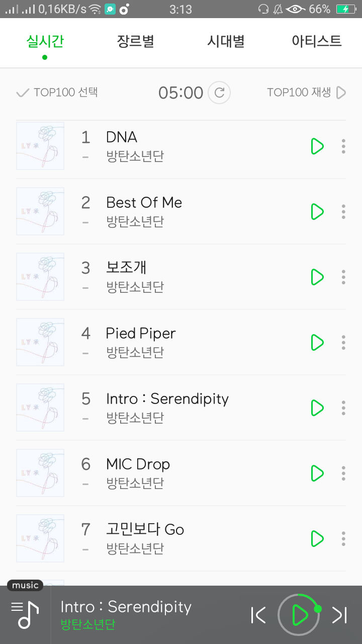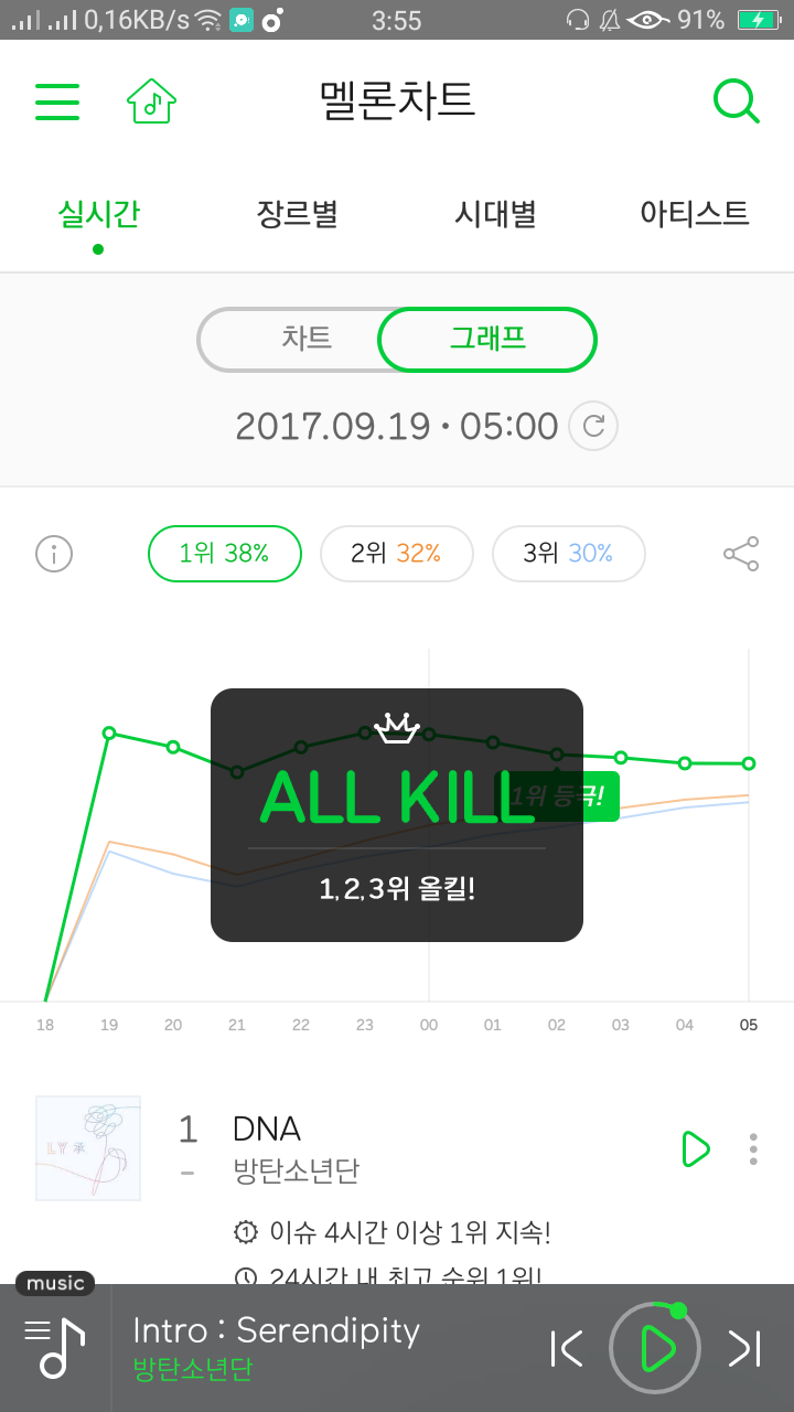 Tại MelOn, BTS chính thức đạt "all-kill" vào lúc 2h sáng (theo giờ Hàn Quốc) với 10 ca khúc nằm trong Top 10 và 8 trong số đó thuộc album Love Yourself: Her. Hiện tại, ca khúc chủ đề DNA vẫn đang đạt No.2 sau “thánh nhạc số” IU.