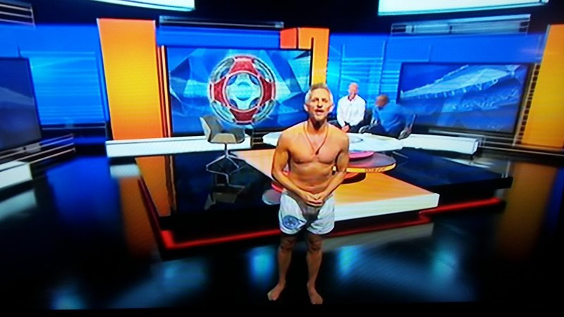 Gary Lineker mặc độc chiếc quần lót khi dẫn chương trình.