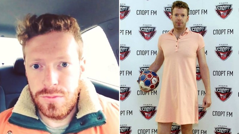 Aleksandr Sofronov có pha ăn mừng “chẳng giống ai” khi mặc váy đi làm mừng Nga giành chiến thắng “sốc” trước Tây Ban Nha tại World Cup 2018.