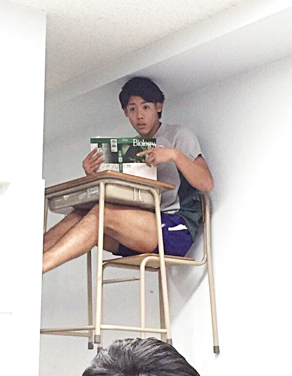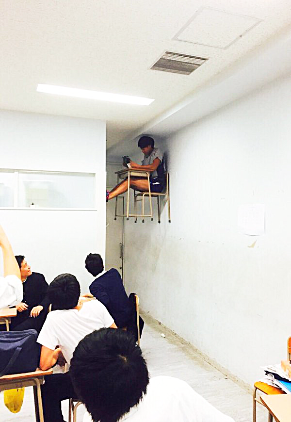 Bức ảnh cậu bạn lơ lửng trên không trung được đăng tải lên trên trang mạng Twitter bởi một cậu bạn trong lớp, cùng chú thích cũng “bá đạo” không kém: “Các bạn biết đấy, sẽ luôn có một người thế này trong lớp học mà, luôn cảm giác rằng mình chẳng bao giờ thuộc về nơi này!”.