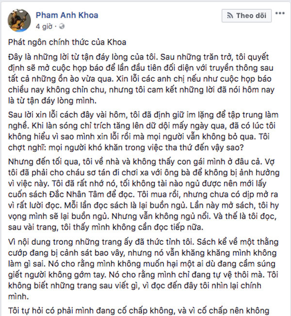 Bức tâm thư của Phạm Anh Khoa trên trang mạng xã hội cá nhân.