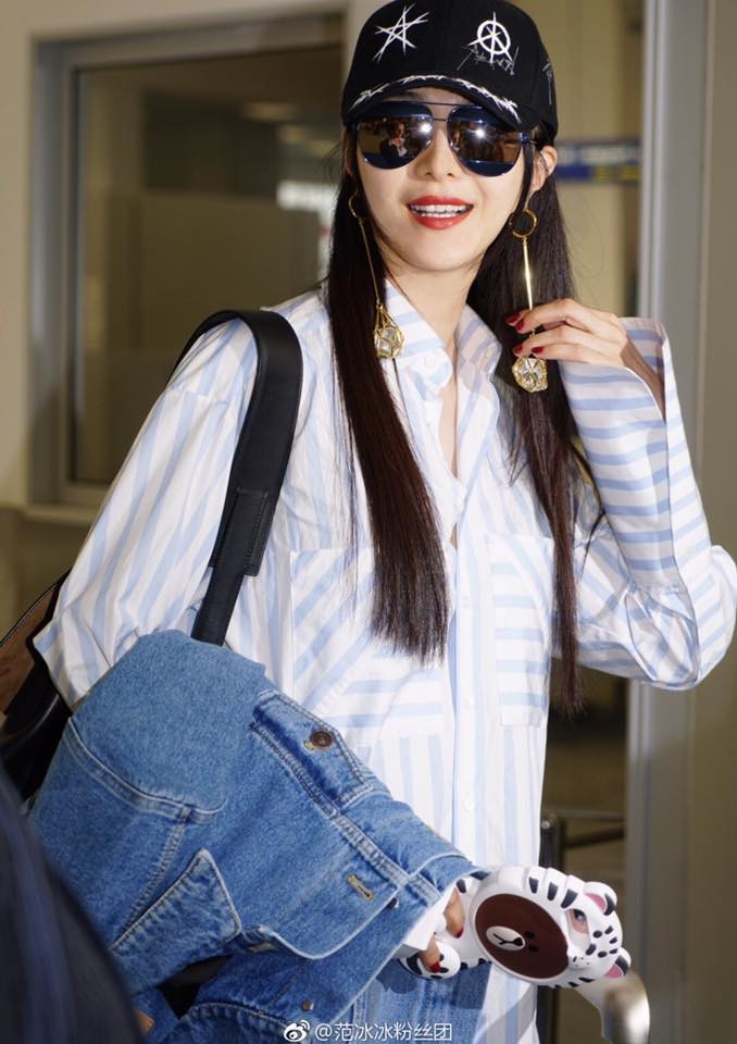 Ngay từ khi xuống sân bay Cannes, Phạm Băng Băng đã nổi bật với đôi khuyên tai to bản và áo dài tay đúng mốt. Tuy chỉ được ngủ có ba tiếng trong đêm hôm trước, nhưng nhìn Phạm Băng Băng vẫn rất tươi tắn.