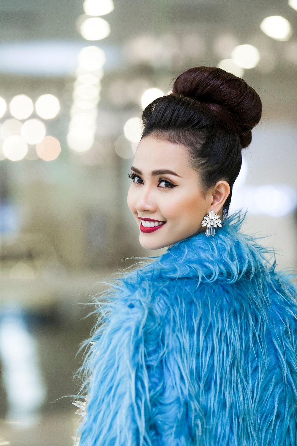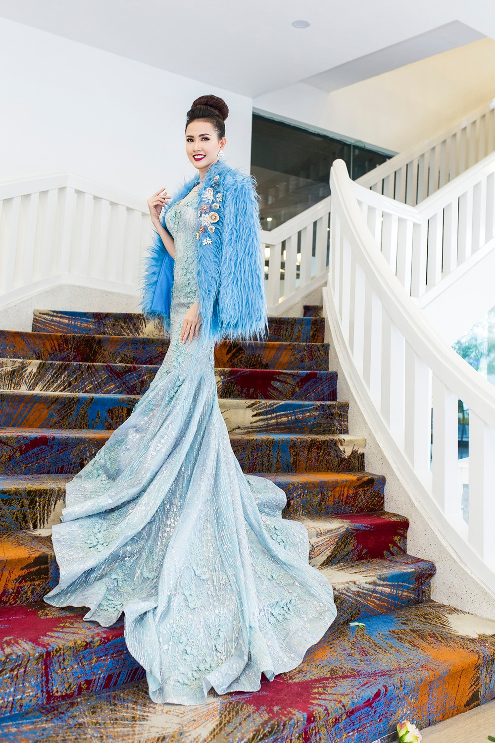 Với bộ đầm đuôi cá xanh ngọc, hoa hậu Phan Thị Mơ khoe hóa thân thành một quý cô lộng lẫy, kiêu sa. Những họa tiết được đính đá tỉ mỉ, công phu giúp người đẹp người đẹp miền Tây thu hút mọi ánh nhìn. Kết hợp cùng với bộ đầm khoe dáng, Phan Thị Mơ đã chọn chiếc áo khoác lông vũ màu xanh nước biển khá sang trọng.