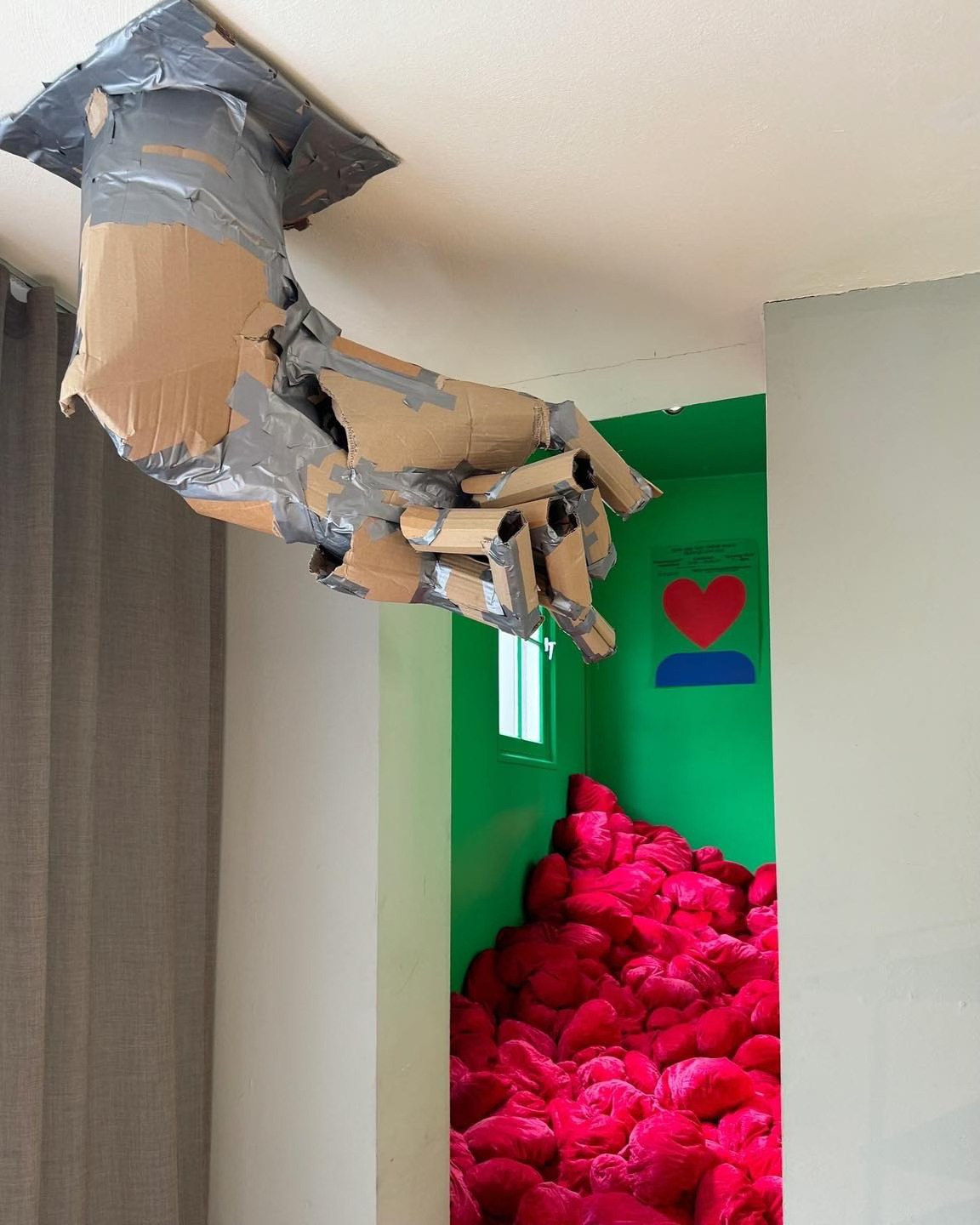"Những miếng bìa carton được dán bằng những băng keo xám để tạo ra bàn tay đấy tượng trưng cho cái sự 'Chữa lành 4.0'. Chắp vá, nham nhở và đầy kẽ hở. Những trái tim đỏ mềm mại dúm dó trong một căn phòng chật hẹp kia tượng trưng cho những con người bị nhốt hẹp trong một không gian kín, thiếu trải nghiệm, sống theo số đông và định hướng bởi một bàn tay vô hình không biết là của ai đấy."