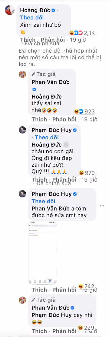 Giữa hàng trăm bình luận cổ vũ tinh thần cầu thủ và khen bé Dâu đáng yêu thì dòng bình luận của Hoàng Đức nhanh chóng trở thành tâm điểm của sự chú ý. Chàng cầu thủ mang áo số 14 viết: "Xinh trai như bố". Đọc qua lời khen này chắc hẳn ai cũng sẽ thích thú nhưng ông bố Văn Đức lại trả lời: "Thấy sai sai nhé". Đi qua thấy sự bất bình, "quàng tử" Phạm Đức Huy lên tiếng: "Cháu nó là con gái, ông đi kêu đẹp trai như bố? Quỳ!".