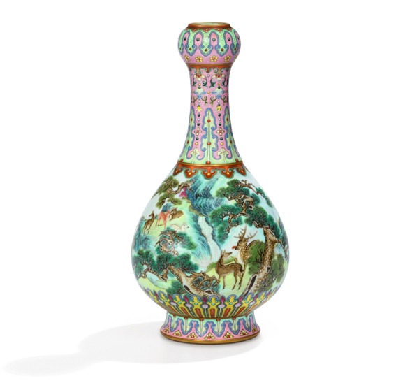 "Những thiết kế phức tạp và khó như thế này là cực hiếm thấy trên đồ gốm sứ thời Thanh," nhà đấu giá Sotheby's cho biết và mô tả những hình vẽ trên thân bình là một bức tranh phong cảnh bình dị, có hươu và hạc.