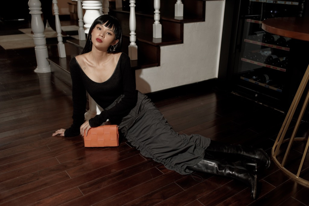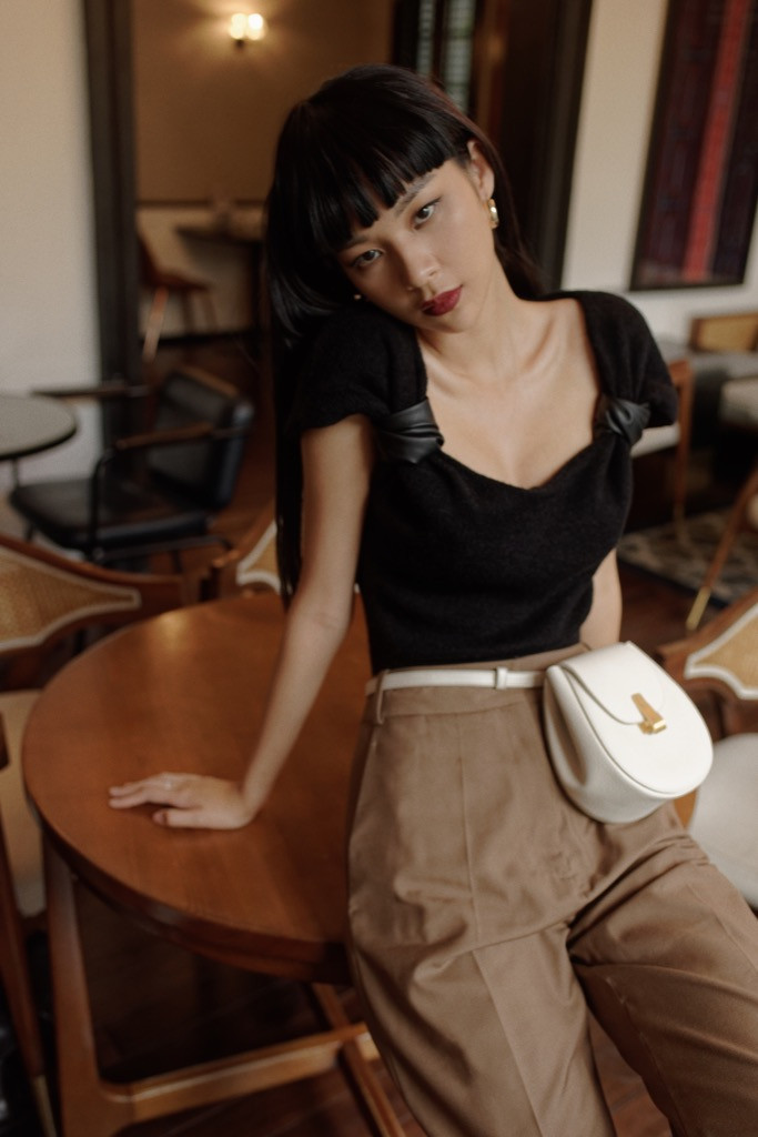 Với cách chơi màu cứng tay và nhuần nhuyễn thông qua gam trắng và đen cơ bản, Phí Phương Anh tạo nên những set đồ mang hình ảnh đối lập dịu dàng và cá tính. Đặc biệt, tông màu tối giản cũng được kéo gỡ bằng cách sử dụng những phụ kiện như túi xách, giày tông cam nude để tạo nên tổng thể hài hoà, bắt mắt.