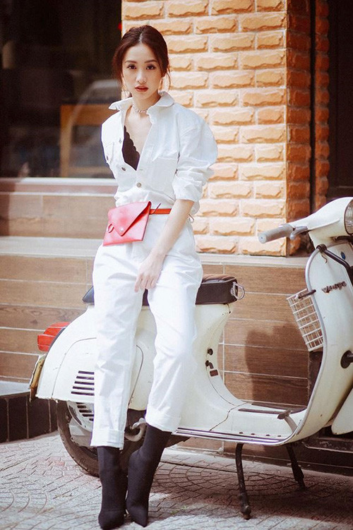 Lúc xuống phố, Hoàng Oanh ăn mặc năng động, cá tính hơn, tuy nhiên vẫn giữ nét sang chảnh của một ngôi sao.