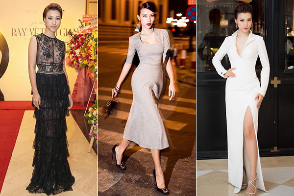 Cũng như nhiều mỹ nhân Vbiz khác, khi đi tiệc, Á hậu ưa chuộng các kiểu đầm dạ hội quyến rũ, khoe lợi thế vóc dáng.