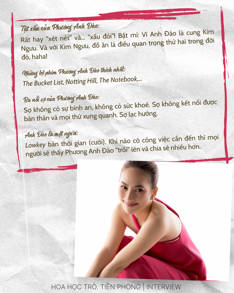 Anh Đào cũng từng có khoảng thời gian hơi khép kín và suy sụp tinh thần. Nhưng may mắn khi mình đã chờ được “ngày mưa tan". Đặc biệt là sau đại dịch, Anh Đào cảm thấy phải trân quý cuộc sống này nhiều hơn. Tự nhiên, mình thấy thời gian của bản thân còn lại quá ít. Chính điều đó khiến Phương Anh Đào cảm thấy phải bứt phá nhiều hơn nữa.