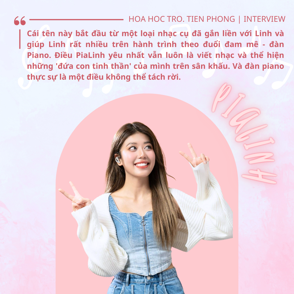 Cái tên này bắt đầu từ một loại nhạc cụ đã gắn liền với Linh và giúp Linh rất nhiều trên hành trình theo đuổi đam mê - đàn Piano. Điều PiaLinh yêu nhất vẫn luôn là viết nhạc và thể hiện những "đứa con tinh thần" của mình trên sân khấu.