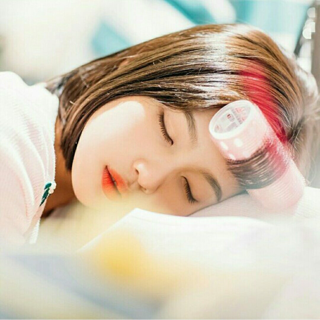 Trưởng nhóm Jihyo vì buồn ngủ quá rồi nên đành để nguyên cả lô quấn tóc và lớp trang điểm.