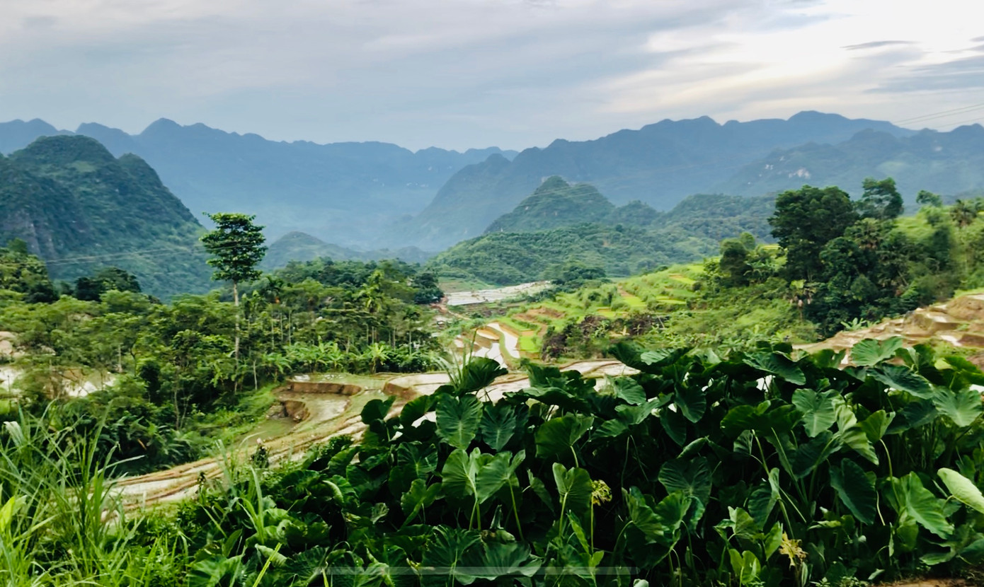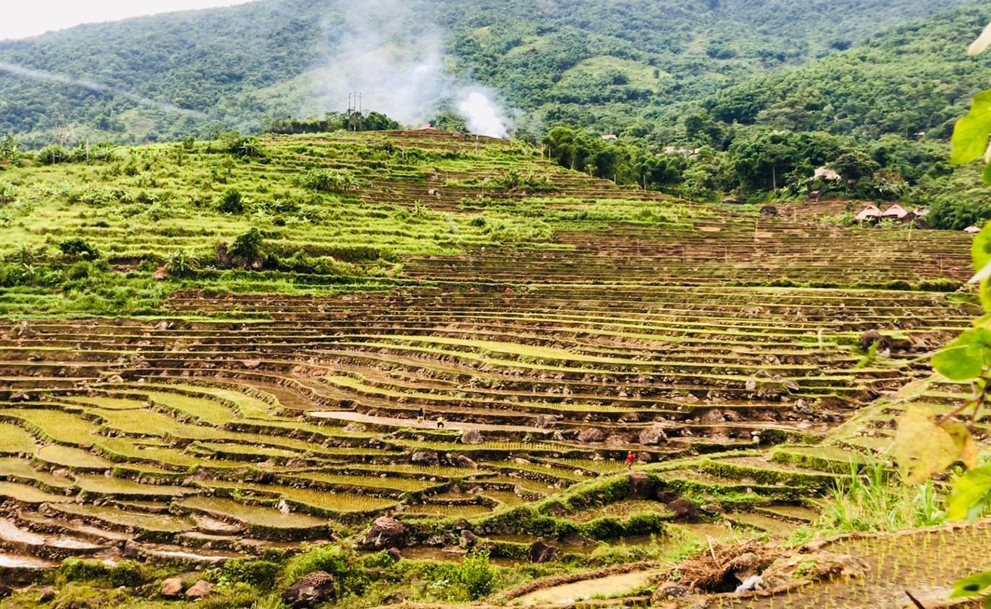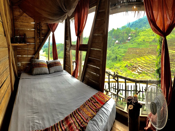 Check-in nhận phòng lúc 3 giờ chiều, chúng tôi chọn căn phòng trên cao, view nhìn thẳng lên ngọn đồi, ngay phía dưới phòng là các ruộng lúa bậc thang. Đầu tháng 7 là thời gian cày xới đất và cấy lúa của người dân. Tuy không được nhìn mùa lúa chín vàng tuyệt đẹp của tháng 10, nhưng bù lại ở vị trí phòng của mình, chúng tôi có thể thấy được những người nông dân đang thong thả làm việc ngay trên bậc ruộng của mình, trông thật gần gũi và bình yên.
