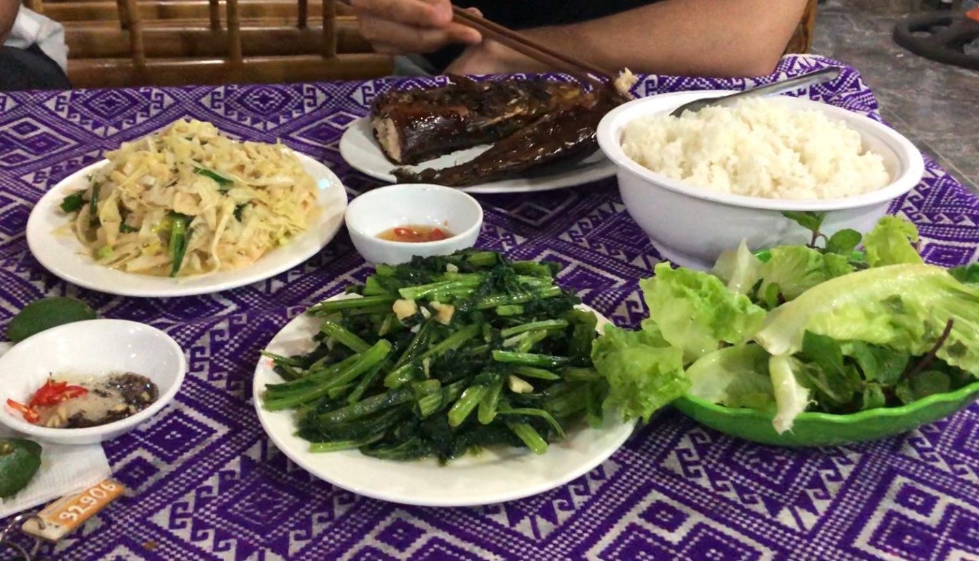 Bản vắng người buồn hiu hắt. Bữa tối của chúng tôi là một dĩa cá tầm nướng, nửa con gà nướng, một đĩa măng xào và một đĩa rau xào tại quán ăn của người dân bản địa ngay trung tâm Bản Lác.