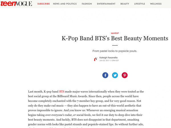 "Với những hình ảnh phá vỡ những chuẩn mực về giới tính, BTS đã đem lại cho mọi người trên toàn thế giới một cái nhìn khác về làm đẹp dành cho nam giới" - Teen Vogue nhận xét.