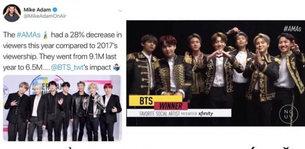 Danh sách các nghệ sĩ quốc tế tham gia thì không thay đổi nhiều qua hai lễ trao giải, nên ai cũng thấy việc BTS không thể tham gia đã khiến AMAs giảm hẳn sức hút. Thậm chí người dẫn chương trình Mike Adam cũng nhắc tên BTS rằng nhóm chính là nhân tố hút khán giả cho AMAs, vắng nhóm một cái là người xem quay lưng ngay.