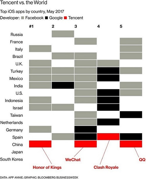 Nơi công ty muốn đến là bên ngoài thị trường nội địa. Tencent, công ty có trụ sở tại Thâm Quyến, đã len lỏi vào mọi ngóc ngách trong cuộc sống hằng ngày tại Trung Quốc. Hơn 2/3 dân số nước này sử dụng hai phần mềm nhắn tin của hãng, là WeChat và QQ, cho tất cả mọi việc, từ nhắn tin đến mua sắm, tán tỉnh, hẹn hò, xem video, chơi game, đến đặt đồ ăn và gọi xe taxi. Theo nhà đầu tư mạo hiểm Mary Meeker, người dùng Trung Quốc tiêu tốn tổng cộng 1,7 tỉ giờ mỗi ngày cho các ứng dụng của Tencent, nhiều hơn cả thời gian sử dụng tất cả các ứng dụng khác cộng lại.