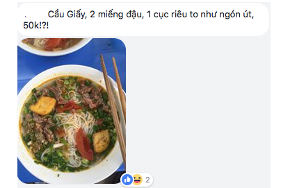 Phía dưới phần bình luận, một thành viên khác cũng lên tiếng chia sẻ bức xúc sau khi đi ăn bún riêu tại Cầu Giấy (Hà Nội): “2 miếng đậu, 1 cục riêu to như ngón út, 50.000 đồng”.